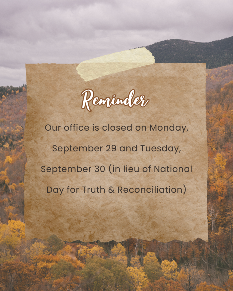 This is a friendly reminder that our office will be closed on Monday, September 29 and Tuesday, September 30, 2025 in lieu of National Day for Truth & Reconciliation. Our office will re-open on Wednesday, October 1st. Thank you for your understanding and we hope that you have a wonderful & restful weekend!